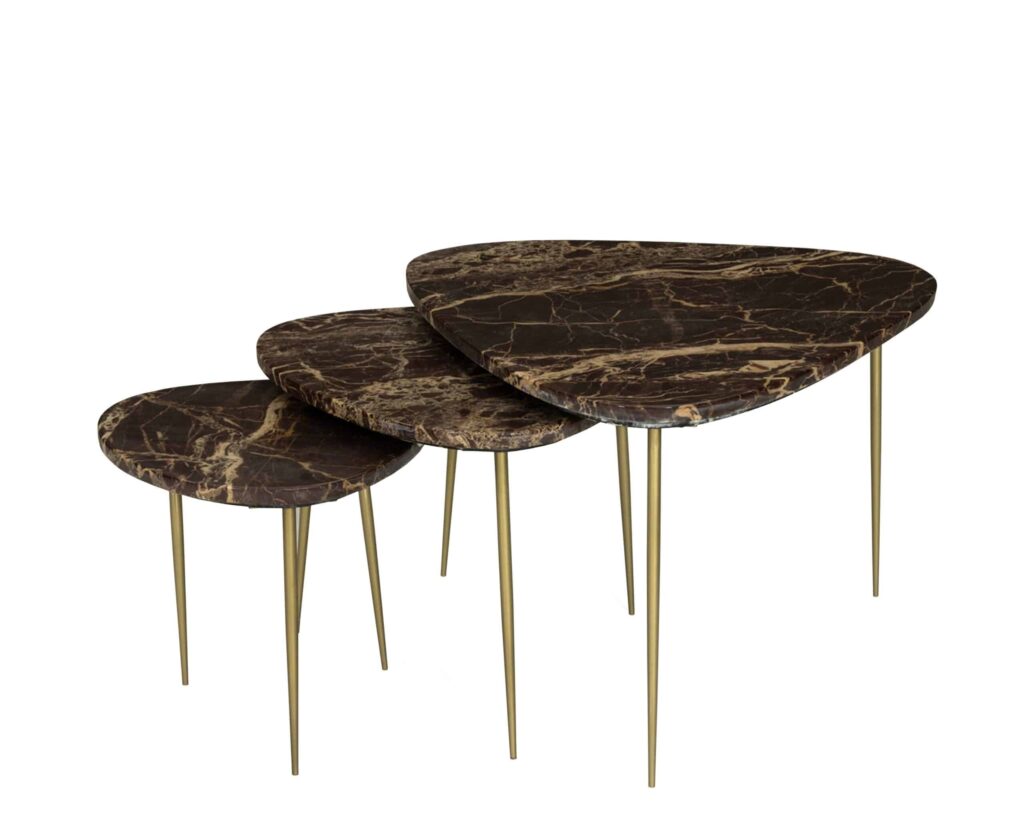 This nesting table set is made using Indian Red Levanto Marble. The marble surface has a smooth finish that keeps the stone easy to maintain while allowing natural colour variation to remain visible. The tables are supported by powder-coated legs finished in gold.