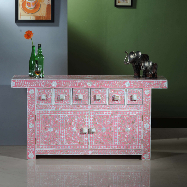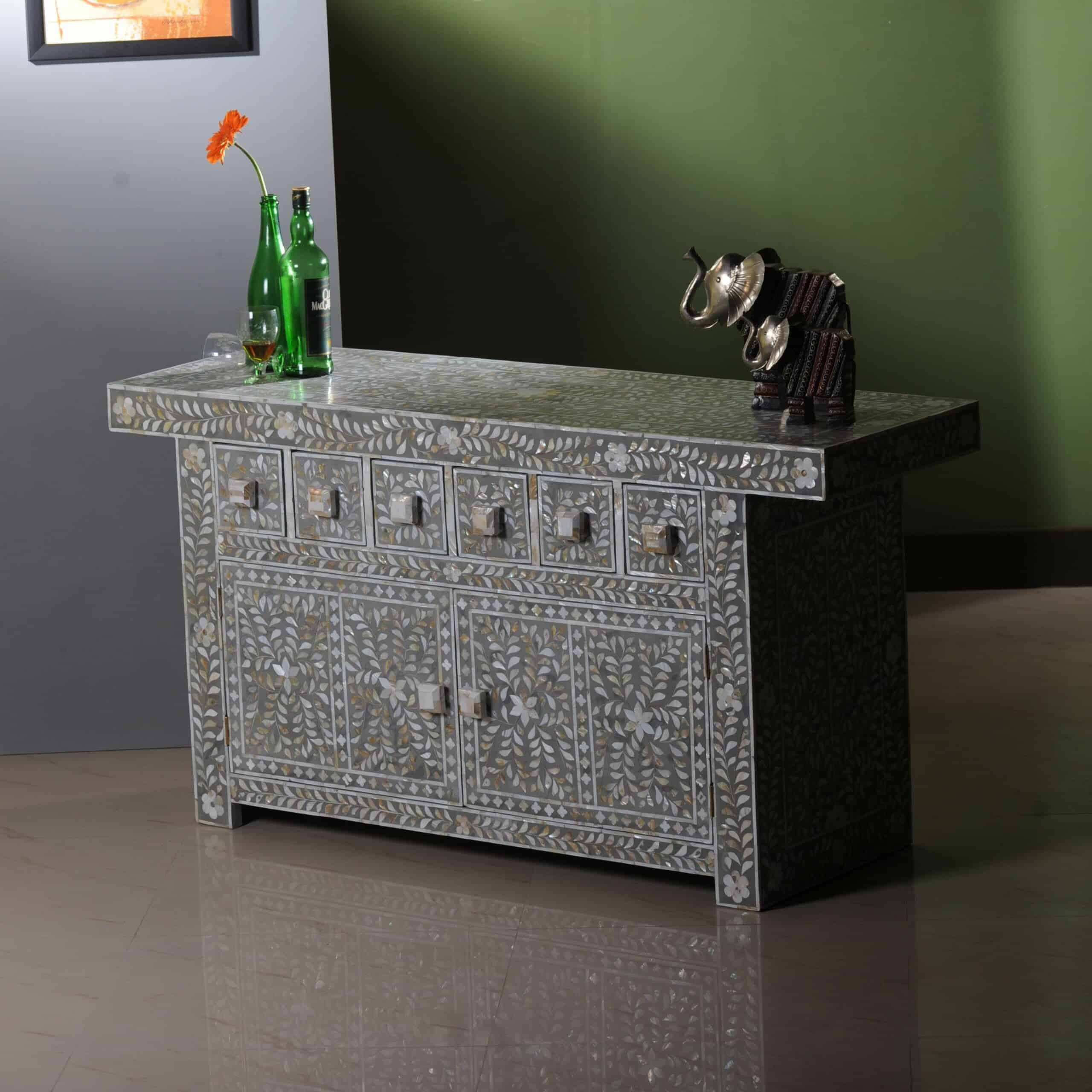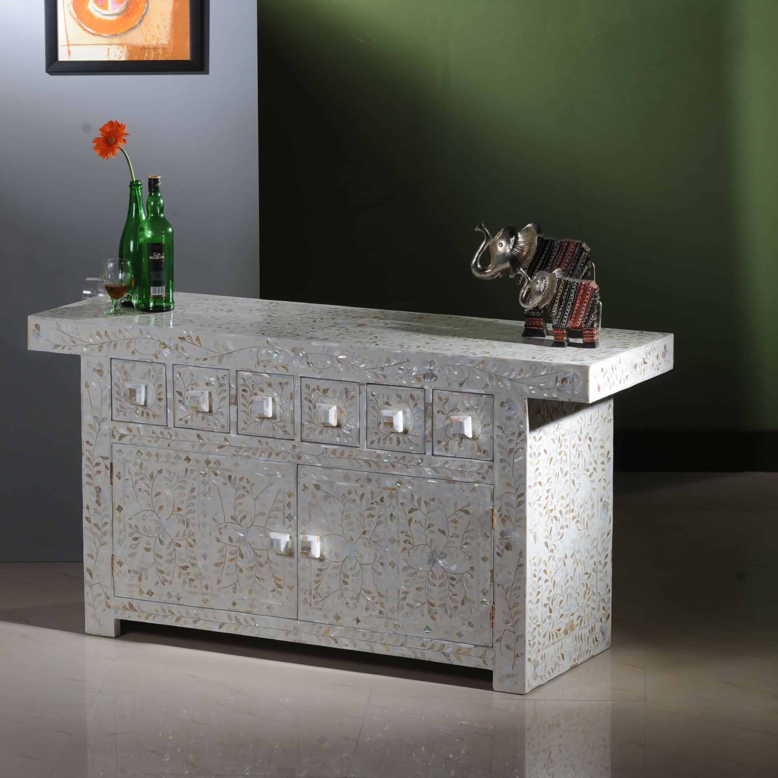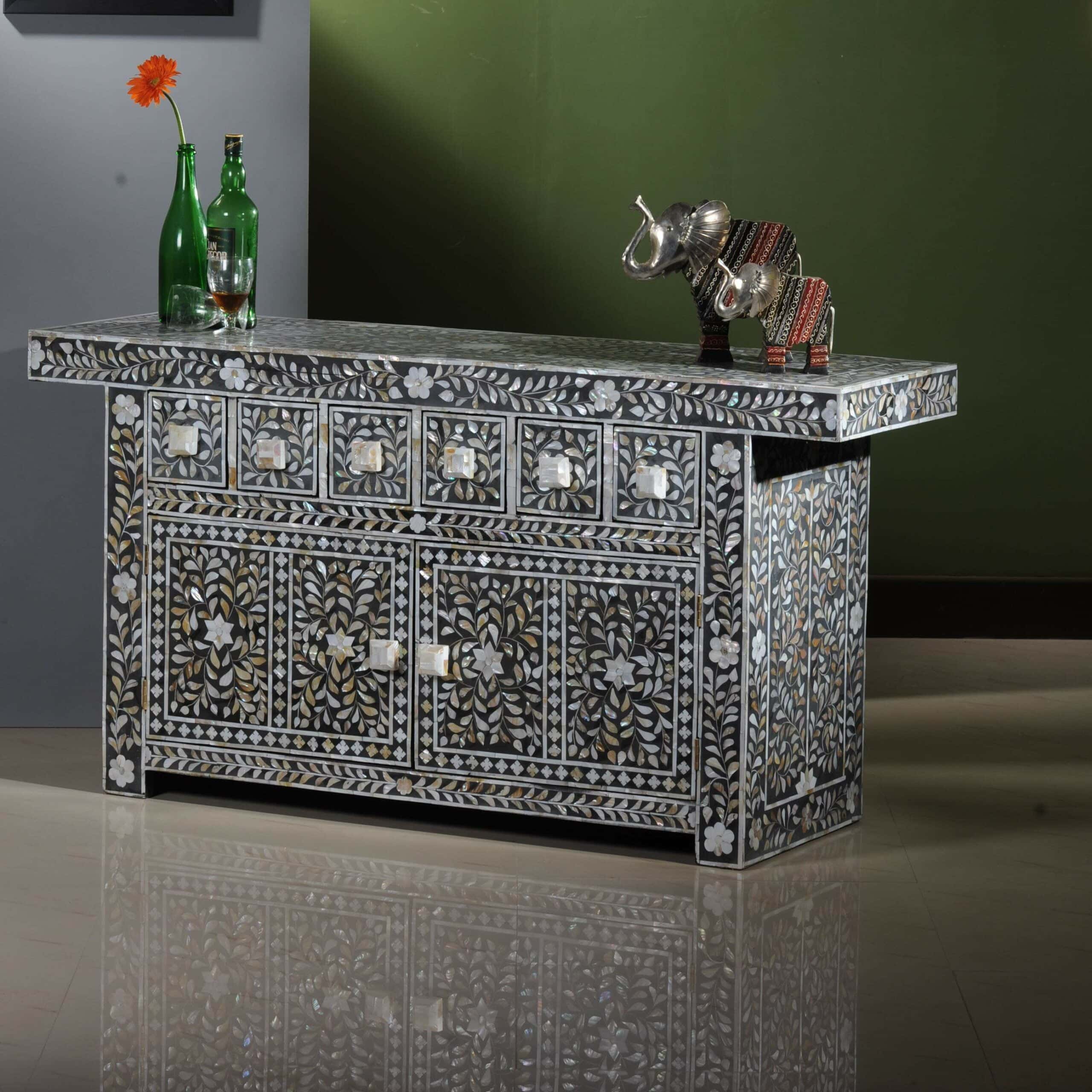It features a classic design with intricate details that are sure to impress your guests. The sideboard is also very easy to care for and it will look great in any home. Handcrafted by Indian artisans, this mother of pearl sideboard is the ideal piece of furniture for any room.