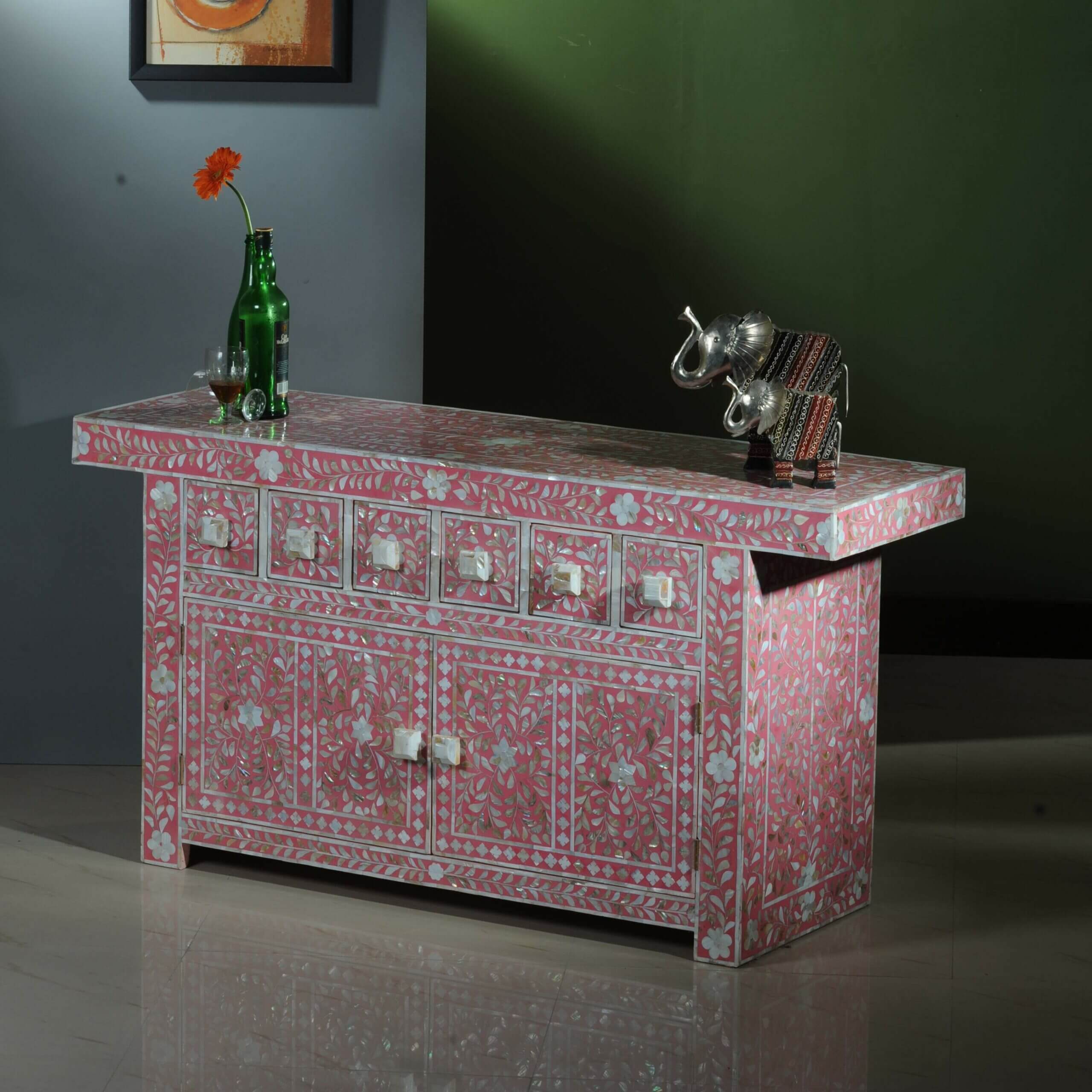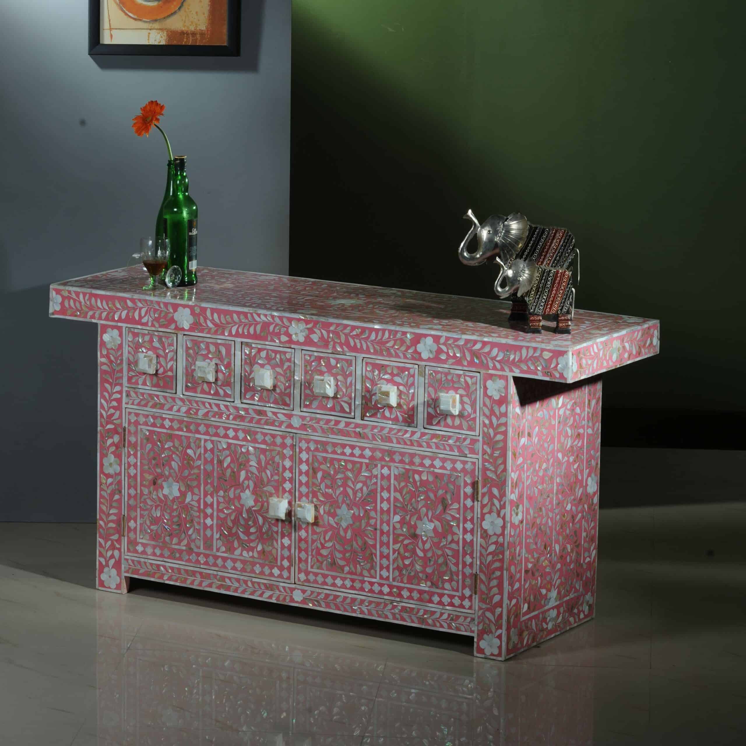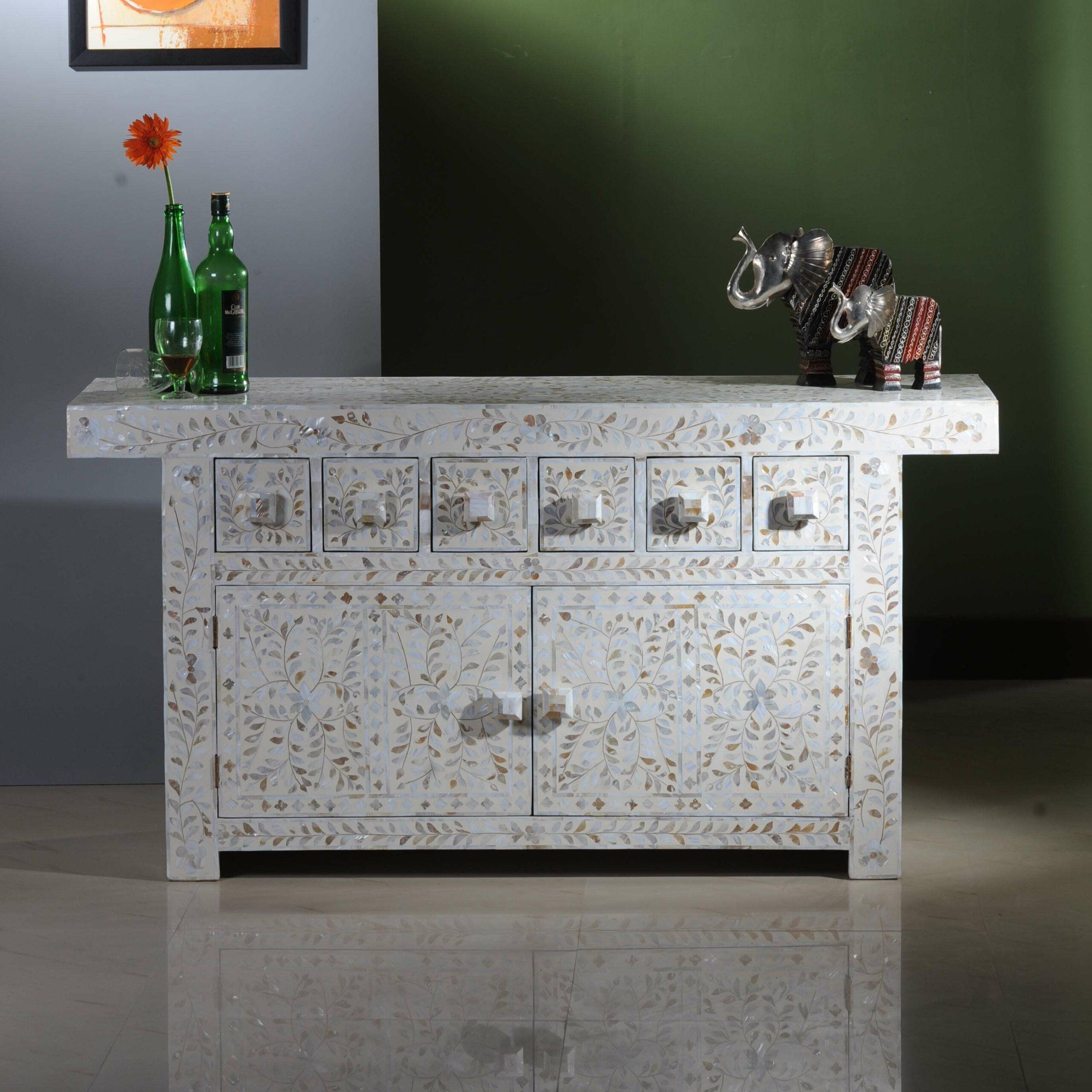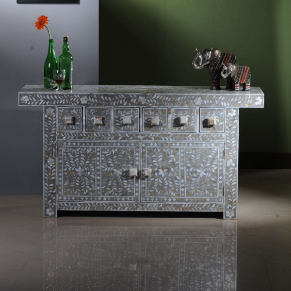 It features a classic design with intricate details that are sure to impress your guests. The sideboard is also very easy to care for and it will look great in any home. Handcrafted by Indian artisans, this mother of pearl sideboard is the ideal piece of furniture for any room.